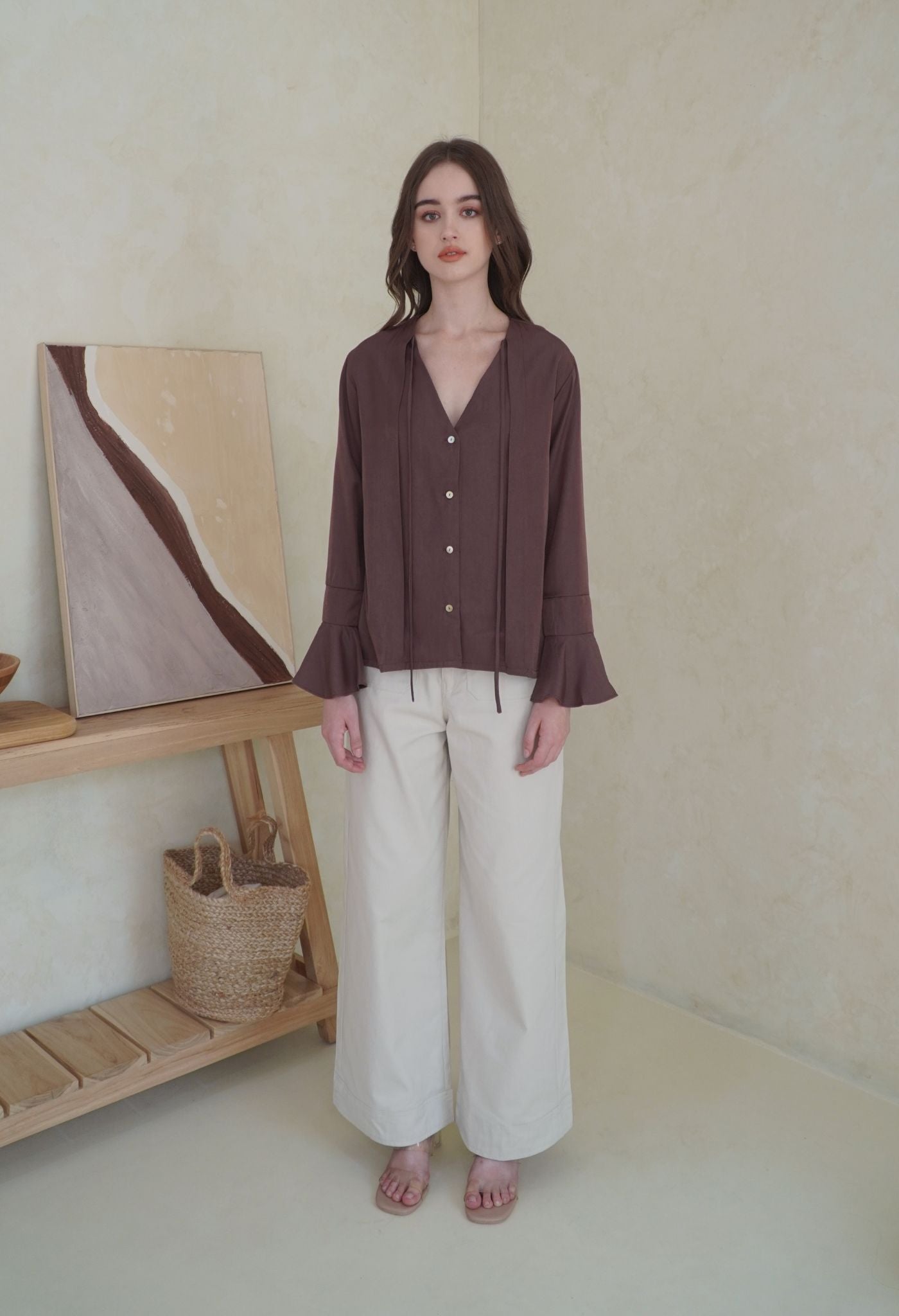 Taking the popular satin shirt to the next level, Agnes was cut from a viscose-poly blend material with a subtle shine finish in rich brown hue. With its loose fit, thin straps detail, and flounce sleeves, this blouse is both casual and dressy at the same time, making it a versatile piece to be styled with. You can either let the straps loose for a laid-back look, or tie it into a ribbon if you’re feeling a bit experimental.