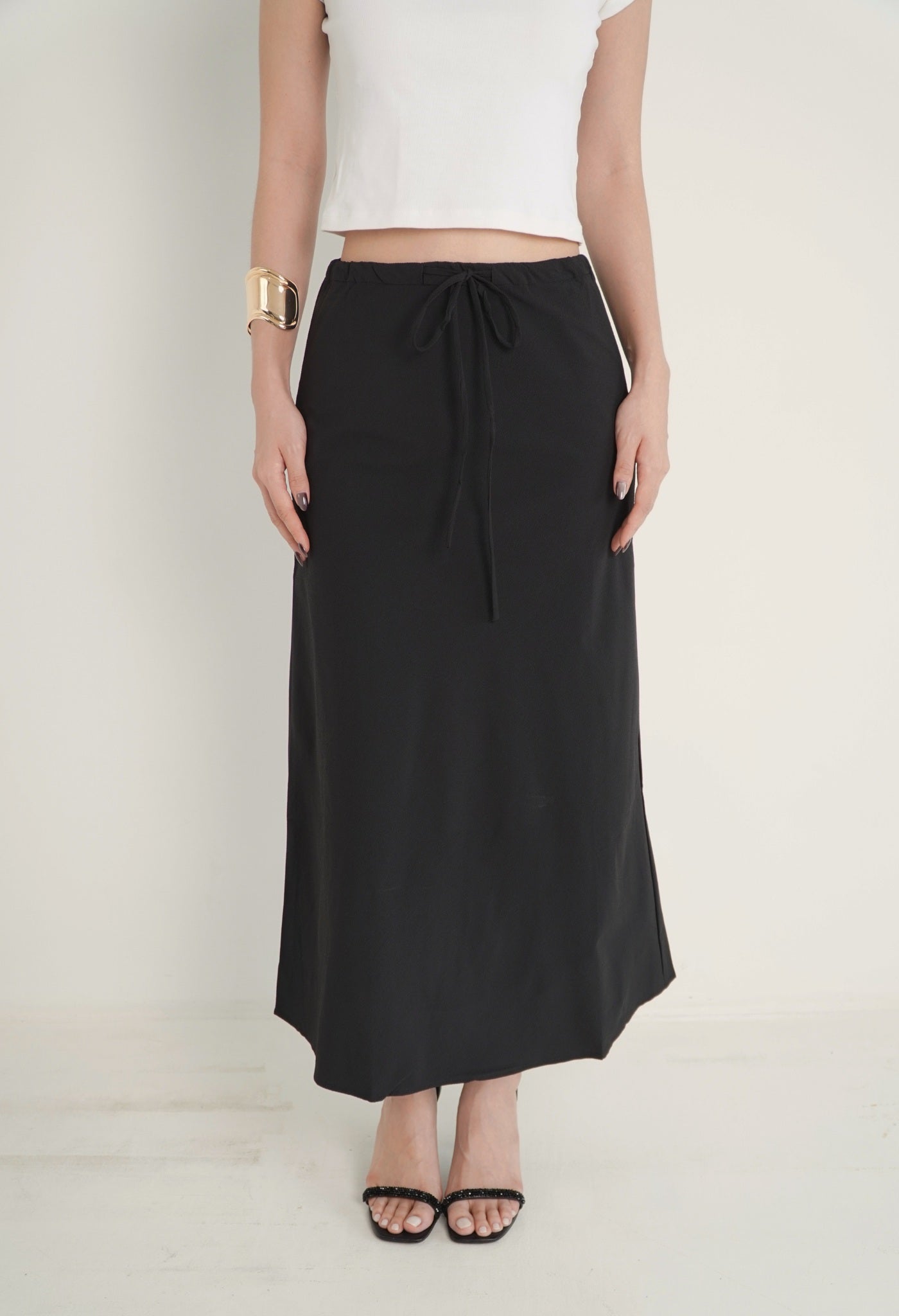 Cut from a bias textured cotton fabric, Alda ensures comfort during all activities and movements. This midi A-line skirt is a must-have wardrobe staple that combines both versatility and effortless elegance. It features adjustable drawstrings and elasticated waistband that would ensure perfect fit for every body type. Fully-lined, elasticated waist.