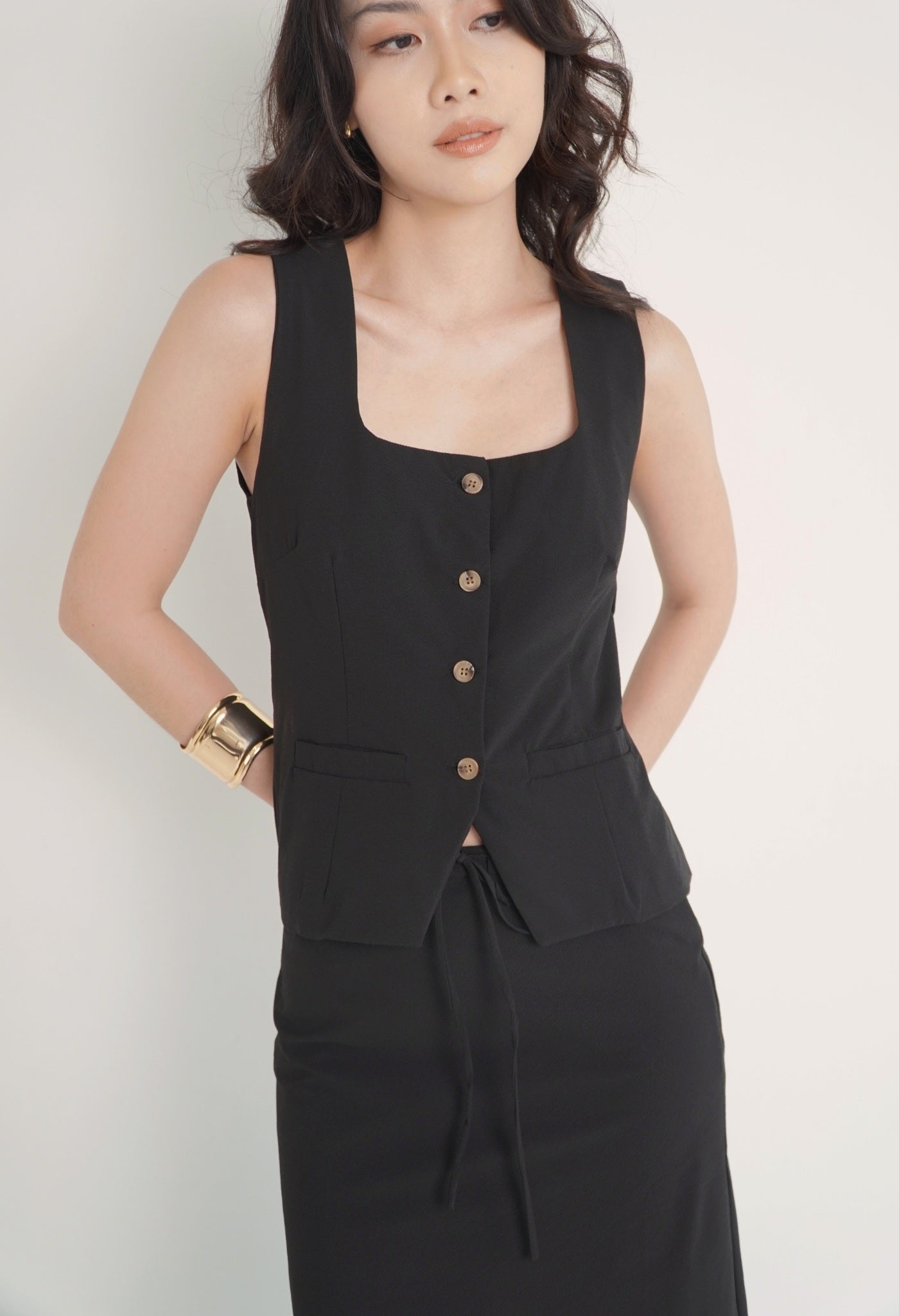 A square neck top that fits and hugs your silhouette flatteringly, completed with an adjustable back buckle that is both functional and chic. Crafted from breathable textured cotton that is perfect for any weather. Fully-lined and carefully designed with a refined cut.