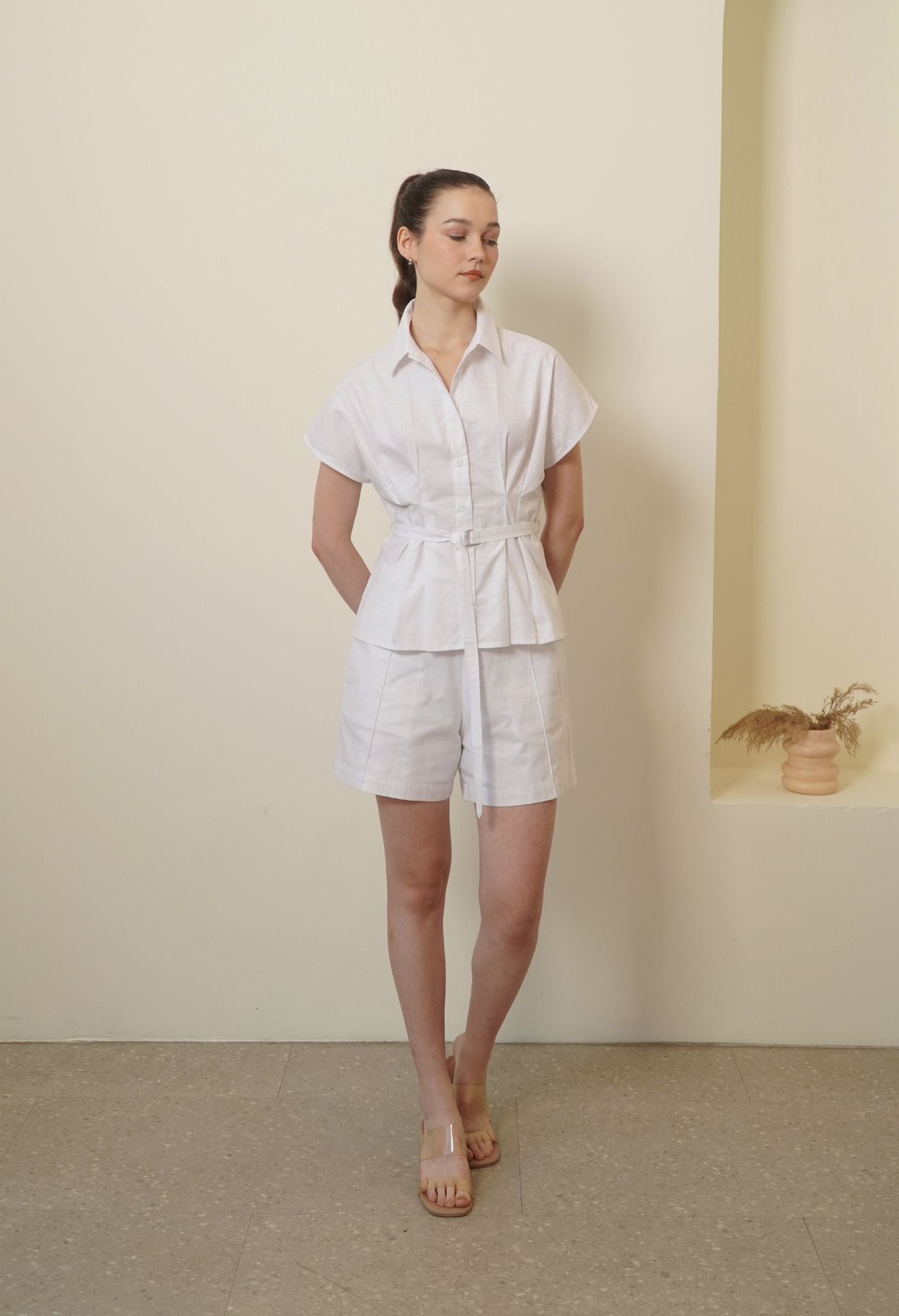 Crafted from 100% cotton, this crisp white top blends comfort with structure. It features a button-down front, short sleeves, and sharp collar for a polished look. Detailed with pleats that cinch the waist flatteringly, and completed with a D-ring belt for added chicness. Lightweight, breathable, and effortless – a perfect piece for warm-weather styling. Wear it as a set with Raelle Shorts, or pair it with any pants in your wardrobe!