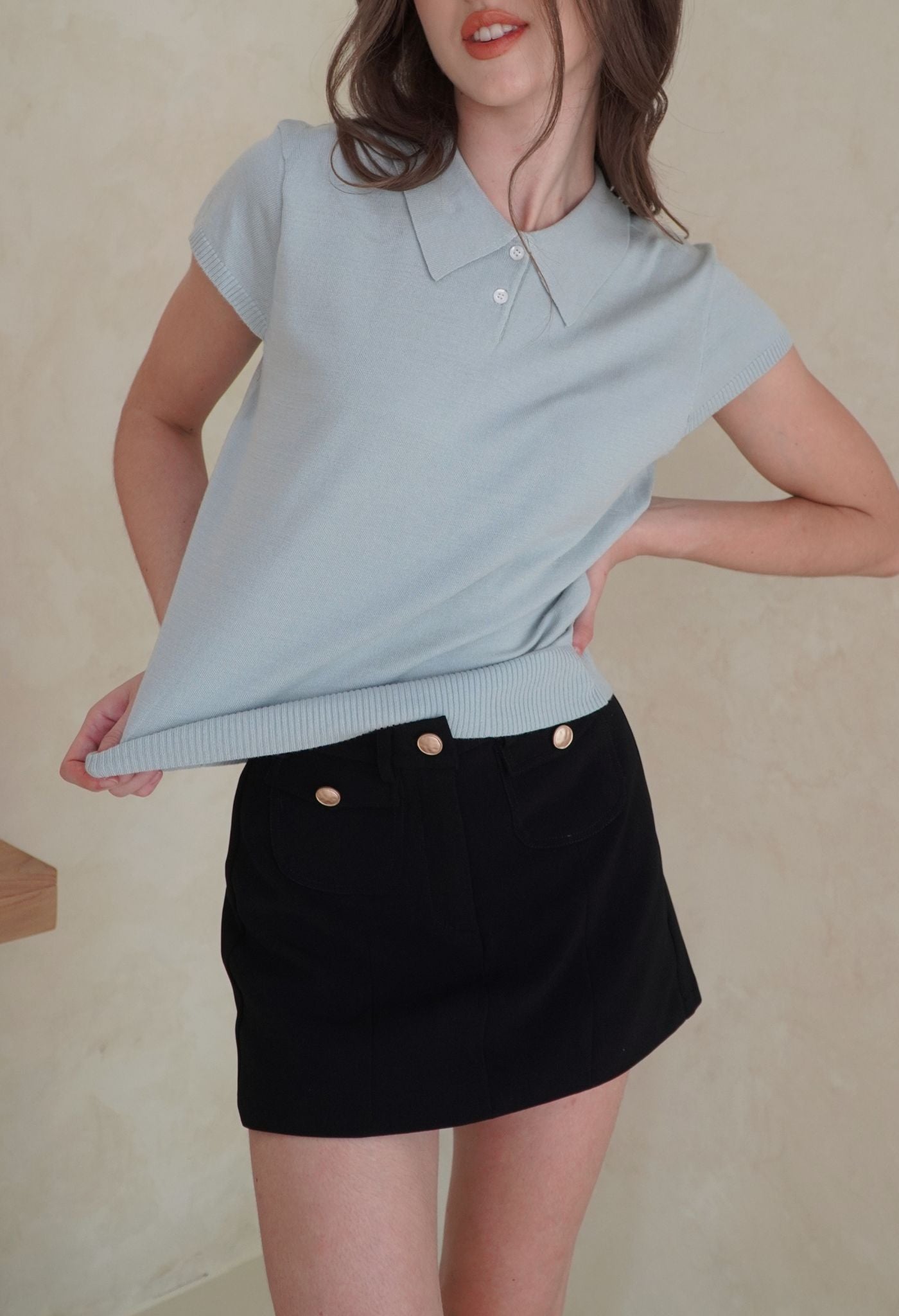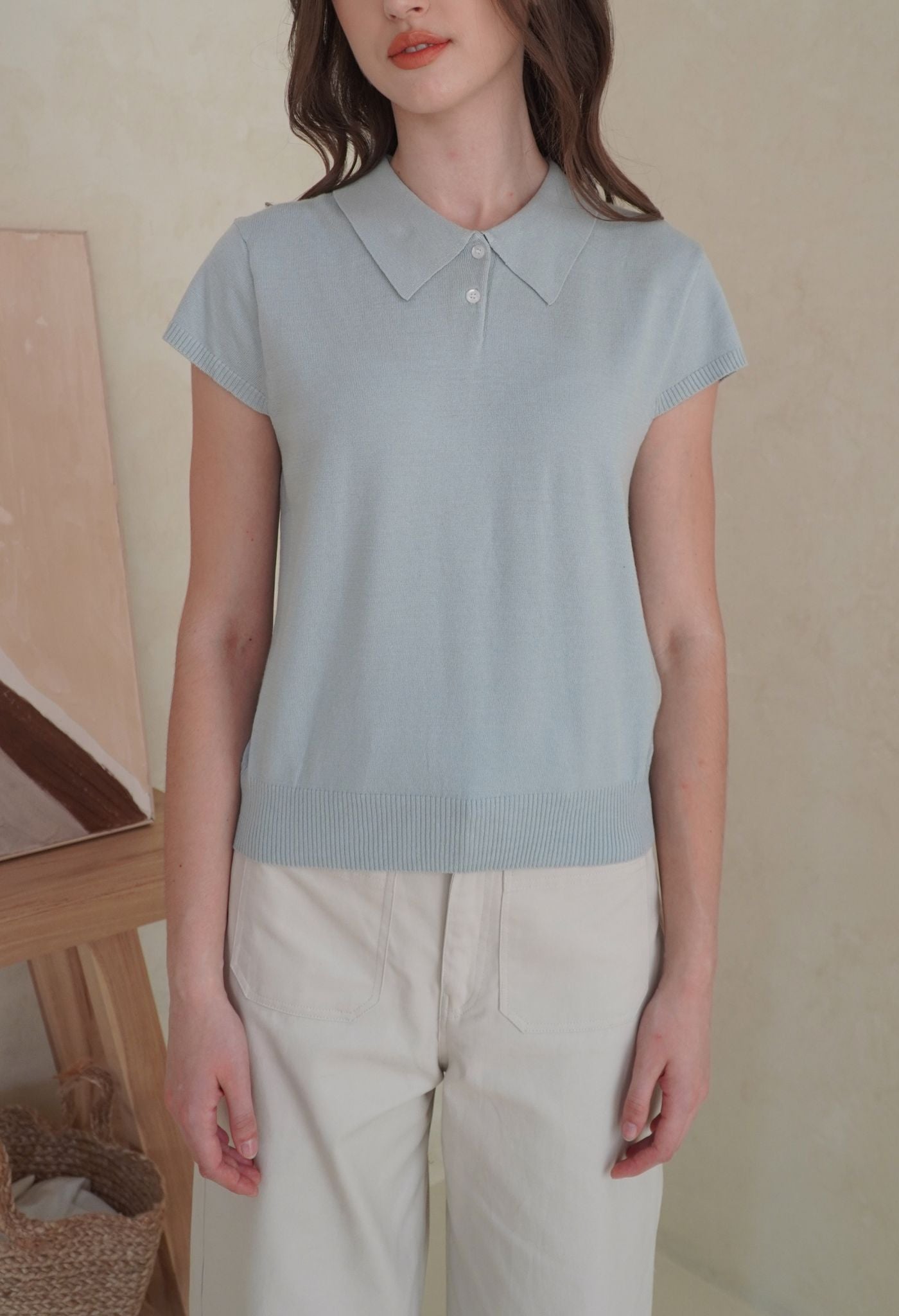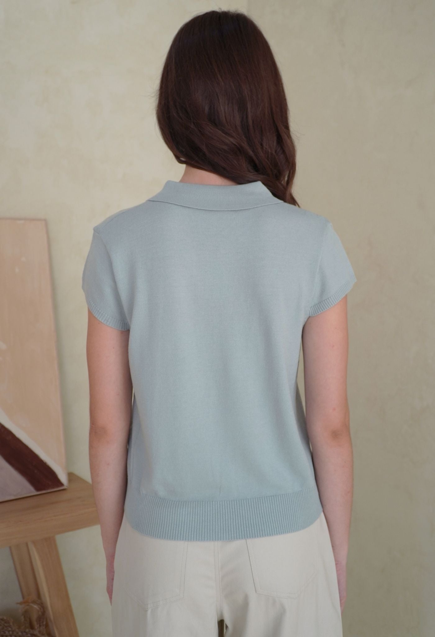 A polo top with short sleeves knitted from soft viscose blend yarn, that gives a casual touch to this collection. Its stretchy material and relaxed fit make it a perfect day-to-day piece that’s both trendy and super comfortable. Style it with our Naya pants to look casually cool, or with a mini bottom for a more cutesy look.