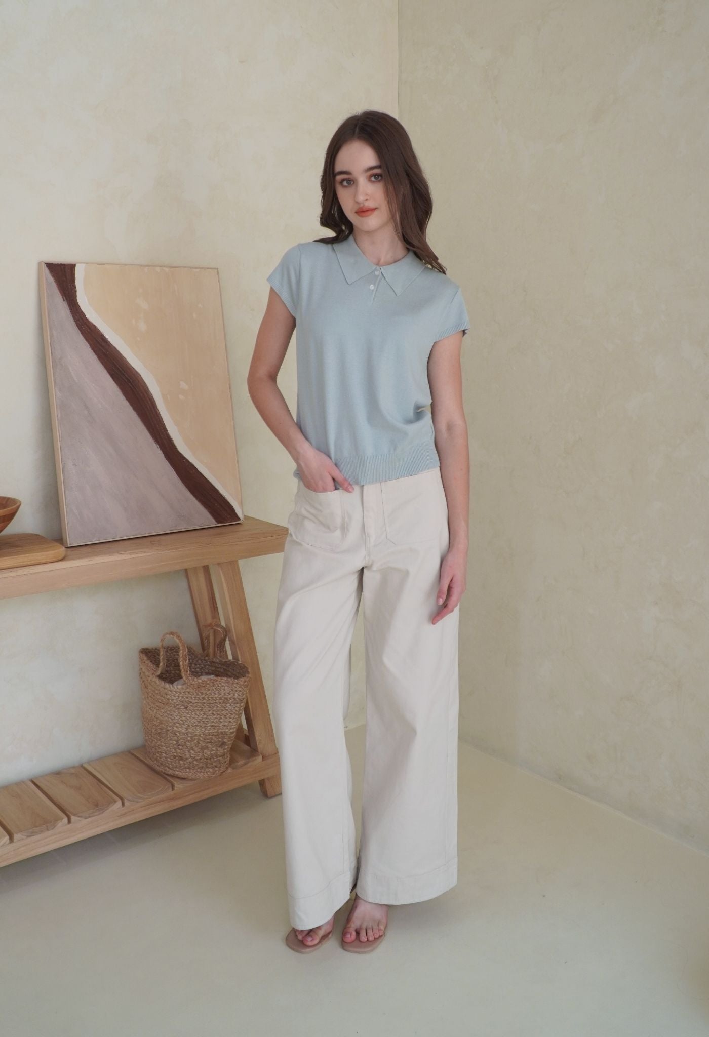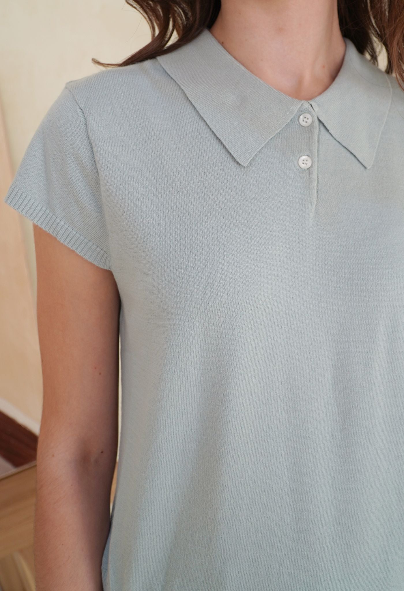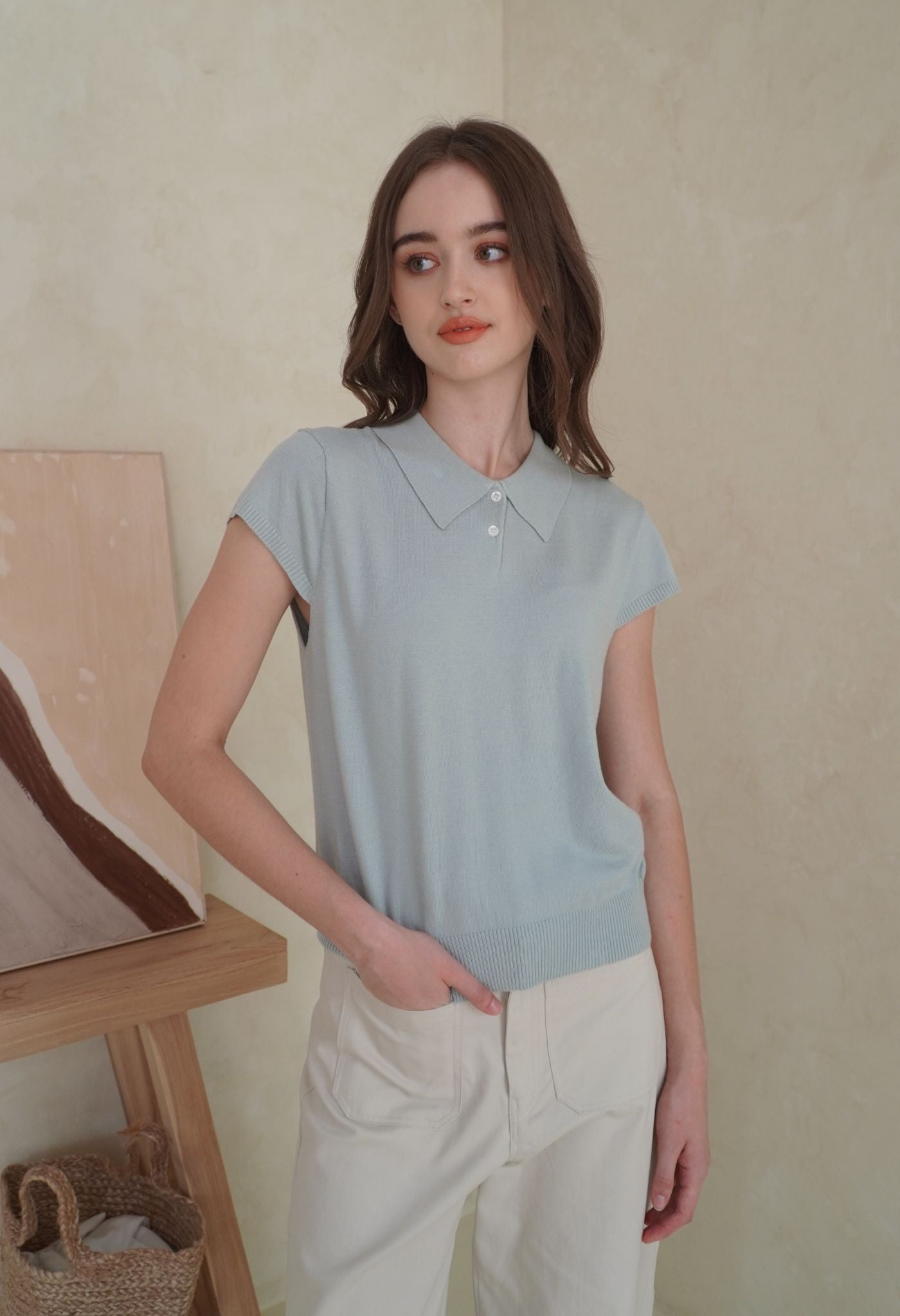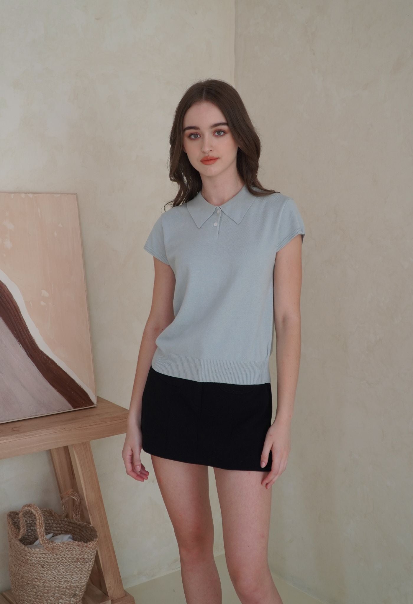 A polo top with short sleeves knitted from soft viscose blend yarn, that gives a casual touch to this collection. Its stretchy material and relaxed fit make it a perfect day-to-day piece that’s both trendy and super comfortable. Style it with our Naya pants to look casually cool, or with a mini bottom for a more cutesy look.