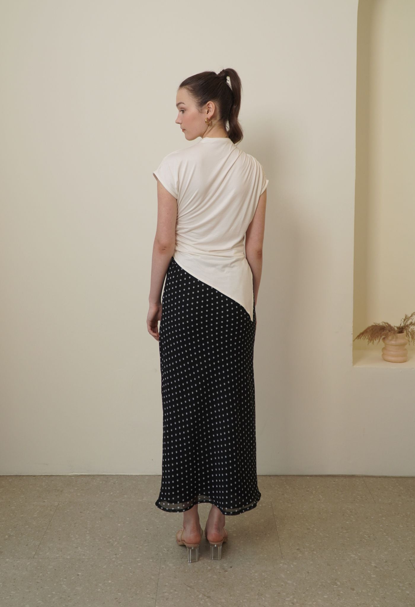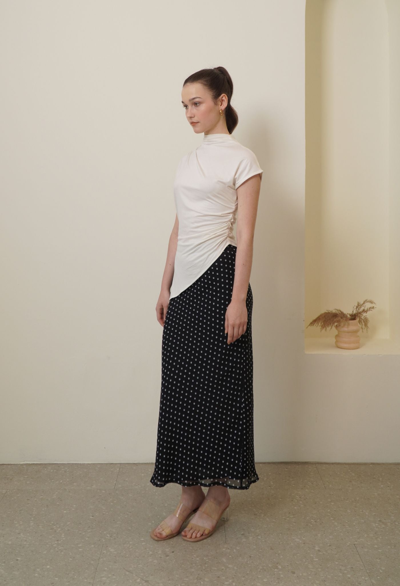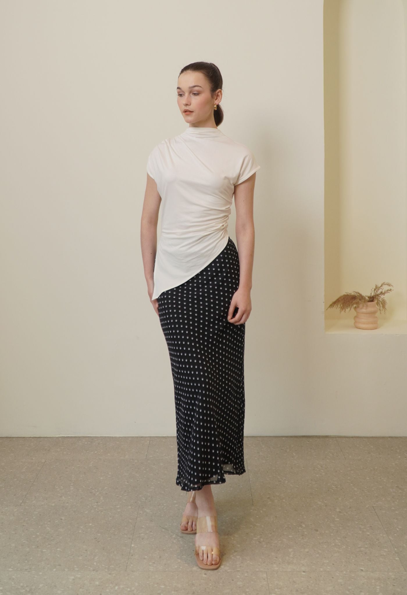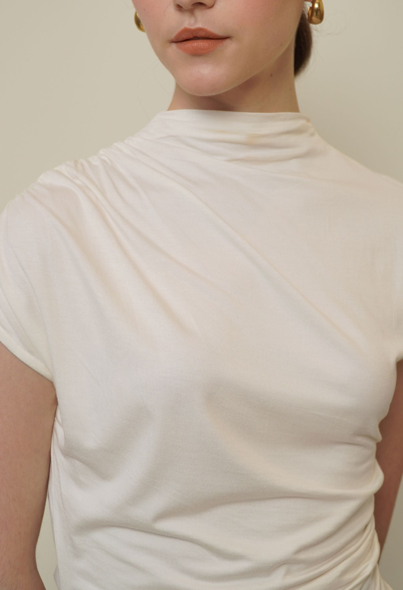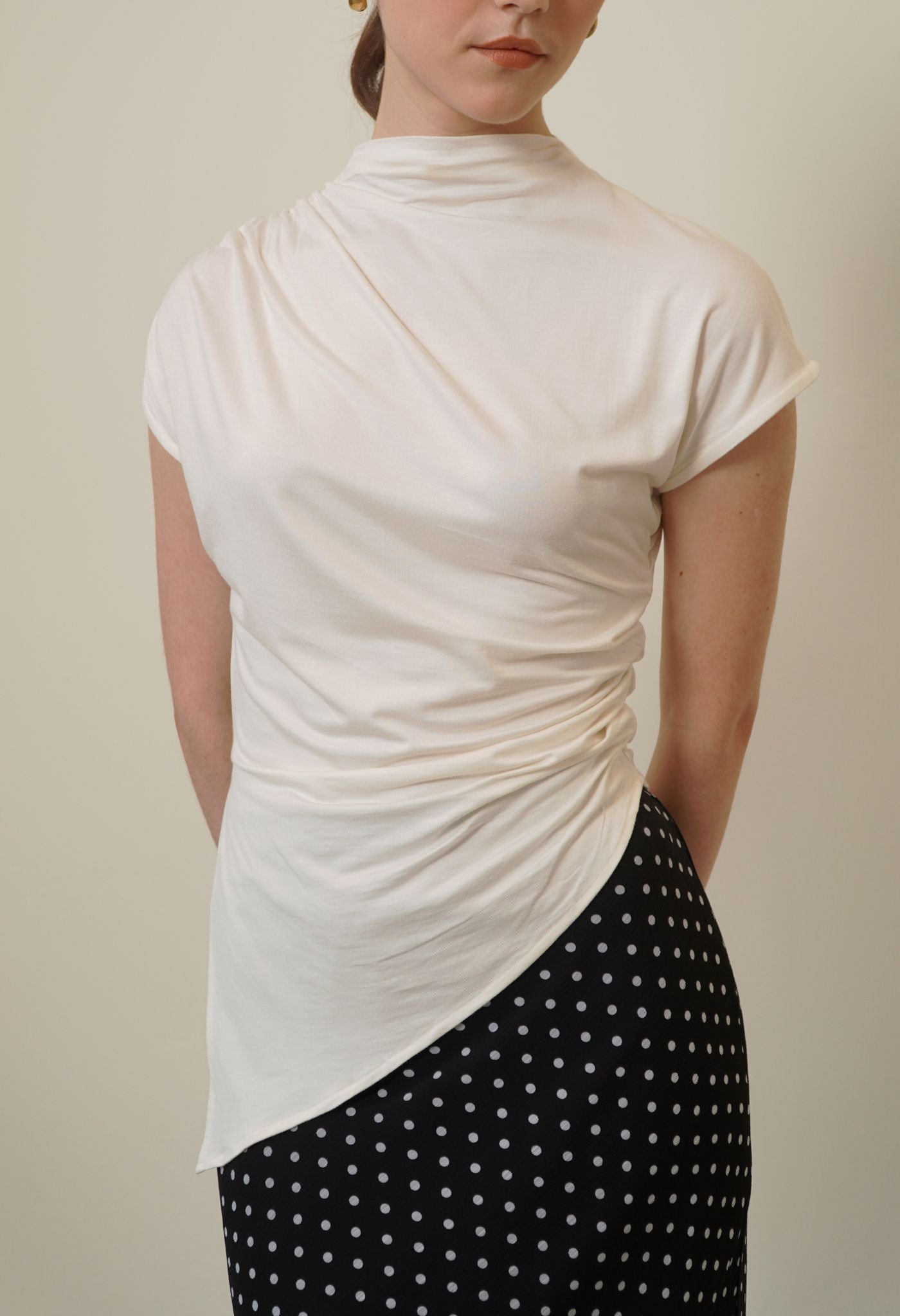 Crafted from soft cotton spandex, this asymmetrical top blends comfort with modern quirk. It features a high neckline with subtle gathers, and a flattering ruched waist detail that cascades into a unique hemline. The gently fitted silhouette and stretchable fabric offer both ease and polish – perfect for refined everyday styling.
