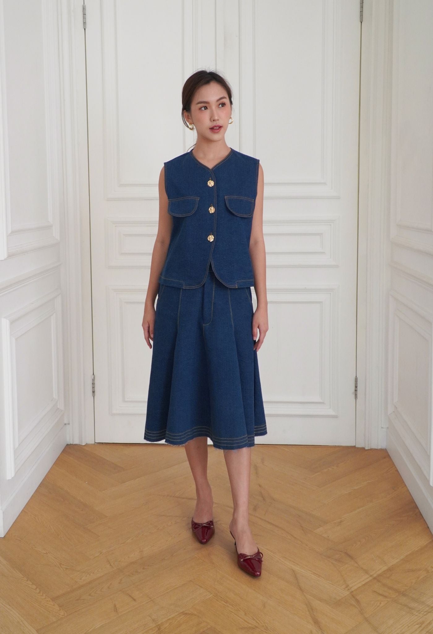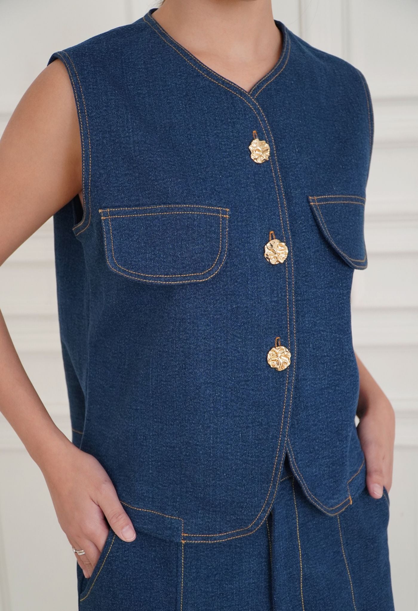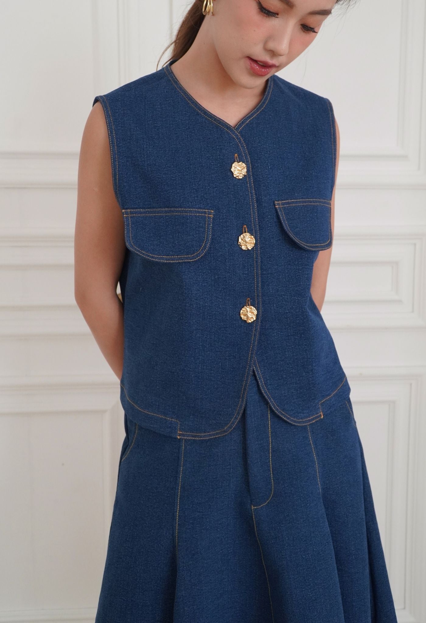 Made from premium washed cotton denim, Marley was cut in a boxy silhouette for an easy daily wear. Detailed with contrasting thread and luxurious gold buttons that elevate this effortless piece. A perfect top for layering or wearing on its own with a fit that flatters all body types. Style it with a pair of wide-leg pants for an elegant look, or with our Soren Denim Skirt in matching shades.