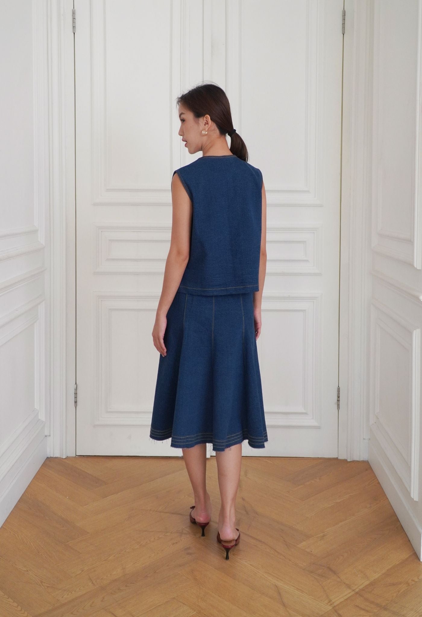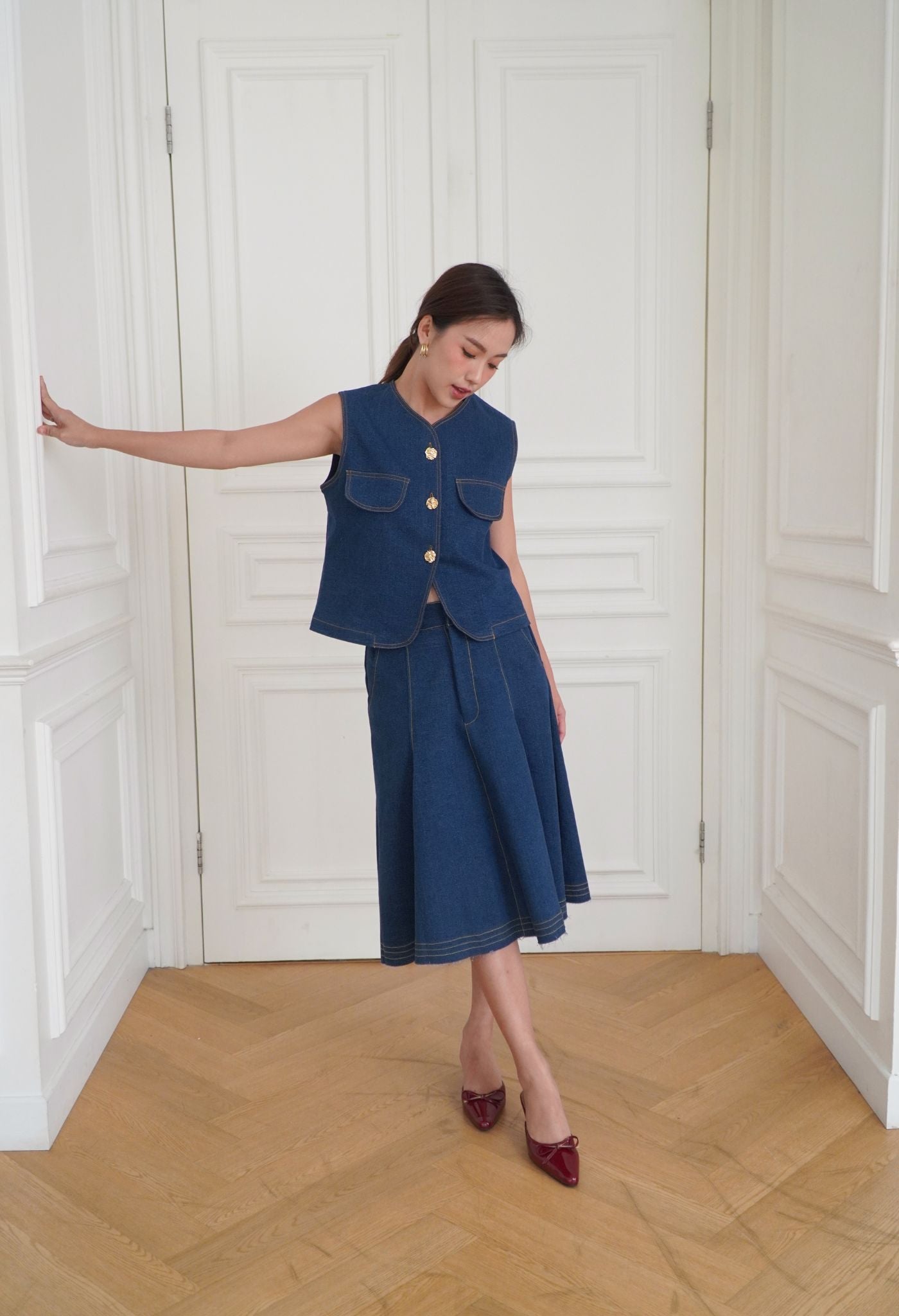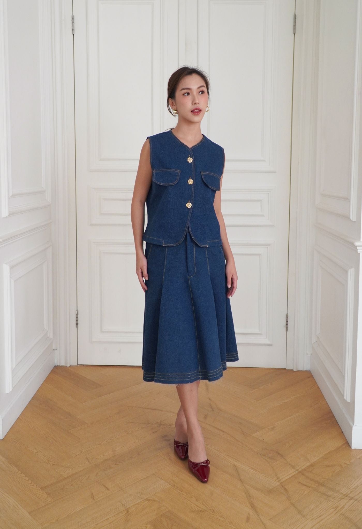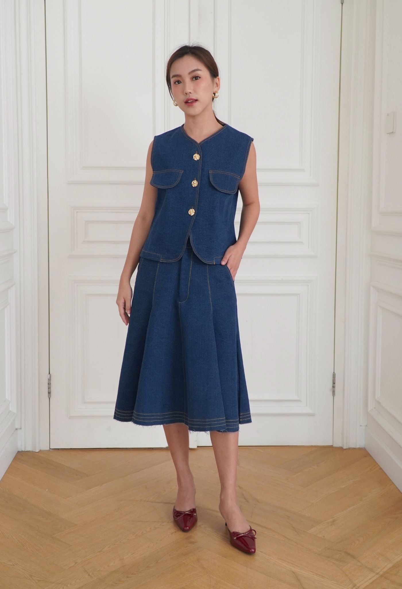 Made from premium washed cotton denim, Marley was cut in a boxy silhouette for an easy daily wear. Detailed with contrasting thread and luxurious gold buttons that elevate this effortless piece. A perfect top for layering or wearing on its own with a fit that flatters all body types. Style it with a pair of wide-leg pants for an elegant look, or with our Soren Denim Skirt in matching shades.