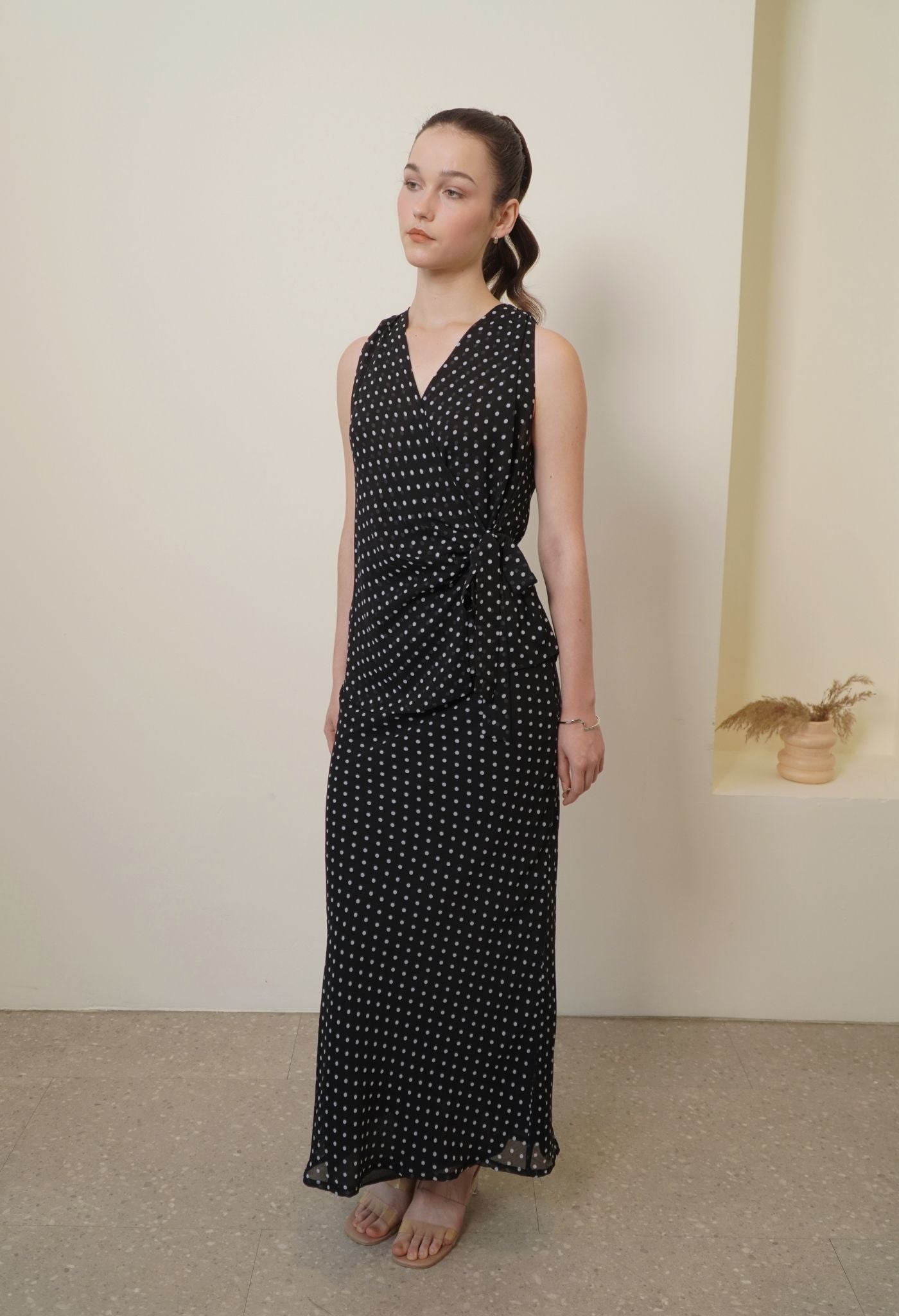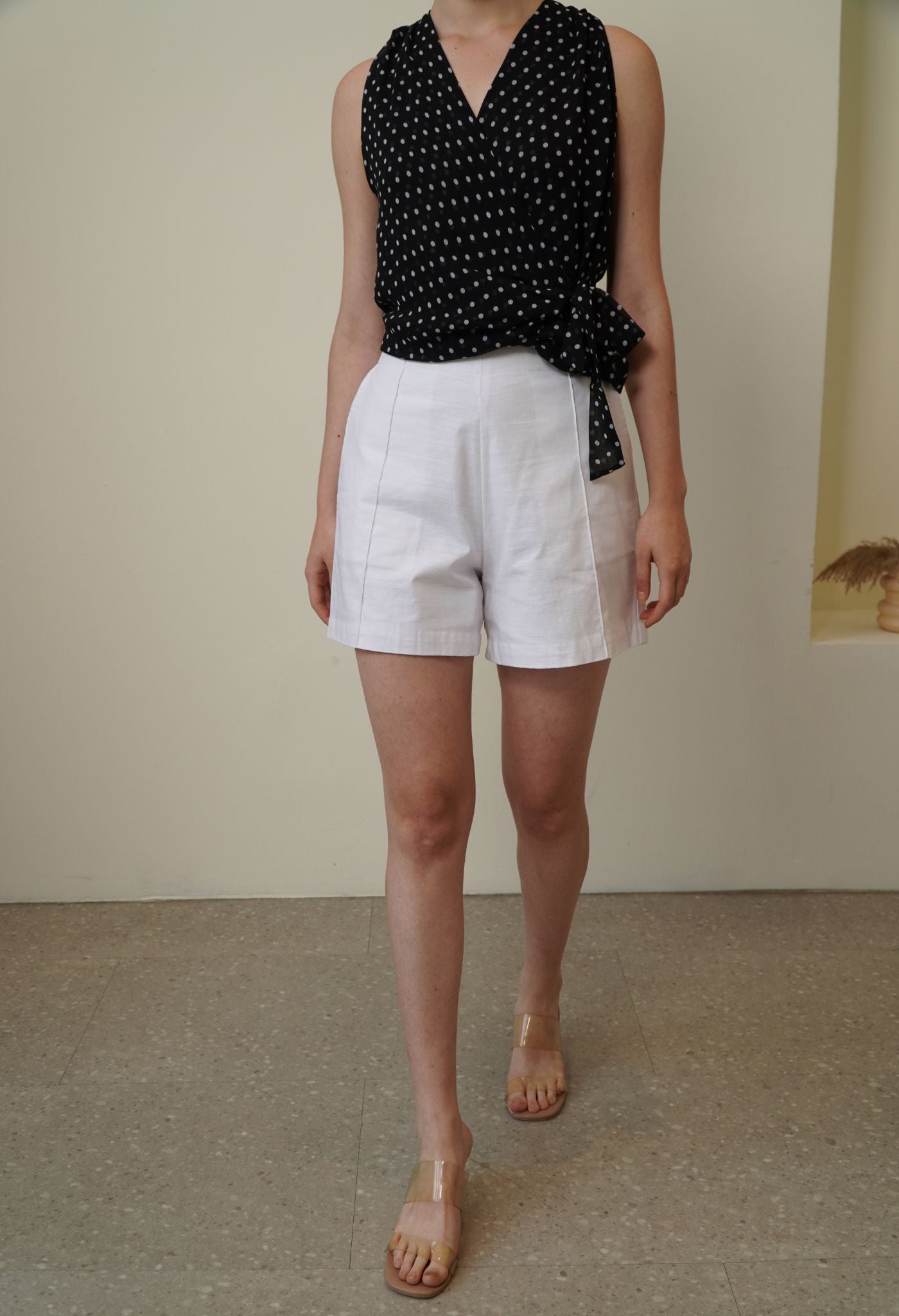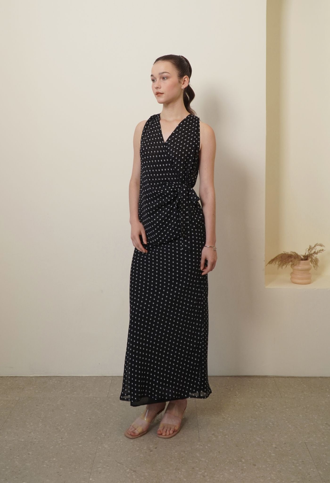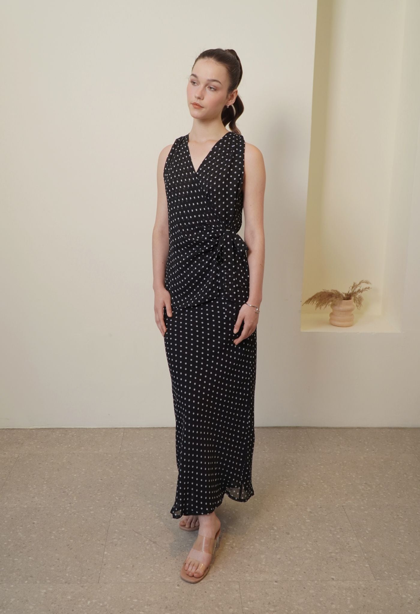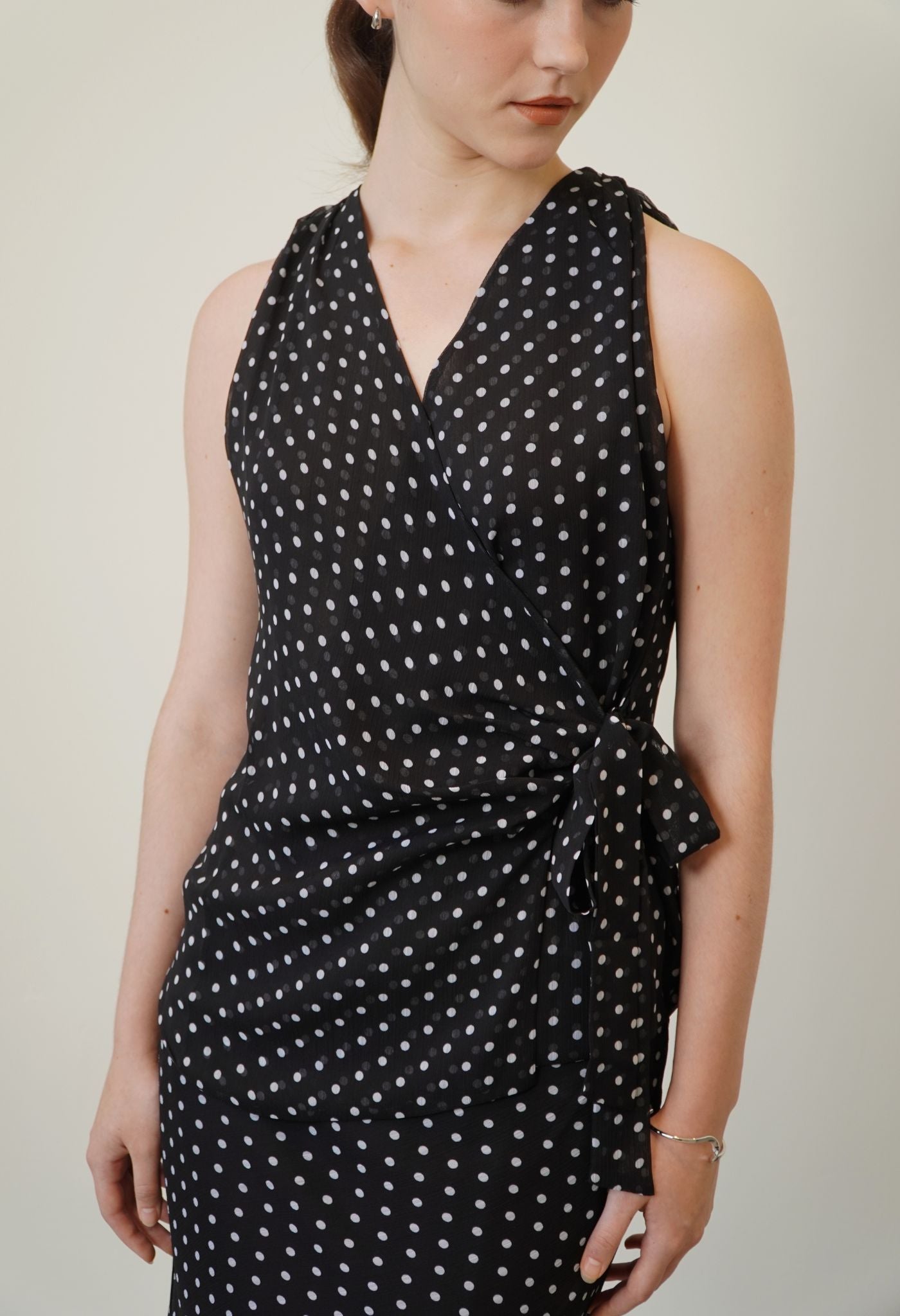A timeless yet chic sleeveless chiffon top in playful black-and-white polkadot pattern. Designed with a flattering wrap silhouette, it ties elegantly at the side to flatteringly accentuate the waist. The FULLY-LINED lightweight chiffon drapes softly, offering both comfort and sophistication. Wear it as a set with Maris Skirt for an unforgettable look or Raelle Shorts for a casual, holiday outfit.